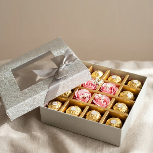 Le Coffret Élégance Argentée est une création pensée pour offrir un moment de raffinement, de douceur et de plaisir gourmand. Avec son coffret argenté chic, ses chocolats Ferrero Rocher et ses roses décoratives délicates, il incarne parfaitement l’élégance féminine dans ce qu’elle a de plus subtil. C’est le cadeau idéal pour marquer une attention avec goût, sans en faire trop.
