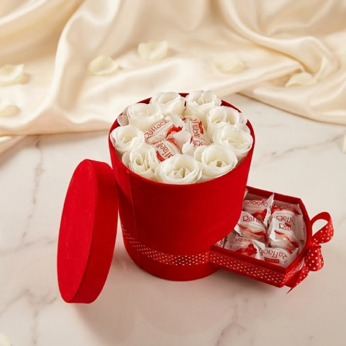 Le Coffret Passion Blanche est un cadeau romantique élégant, idéal pour une occasion spéciale. Il associe de délicates roses blanches, de savoureux chocolats Raffaello et un coffret rouge premium avec tiroir, prêt à offrir. Un coffret cadeau femme qui exprime l’amour avec douceur et raffinement dès l’ouverture.