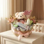 Le Coffret Princesse Élégante est un cadeau naissance fille premium, présenté en gâteau de couches raffiné. Il comprend une peluche douce, des produits de soin pour bébé, des accessoires essentiels et des ballons “It’s a Girl”, le tout prêt à offrir. Un coffret élégant et festif, parfait pour célébrer une naissance en Tunisie. 🎀👶✨