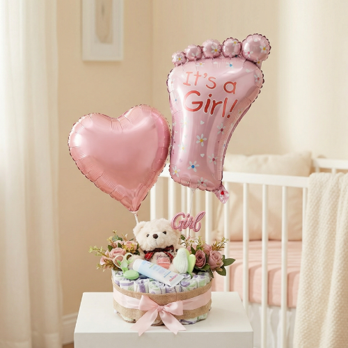 Le Coffret Princesse Élégante est une création délicate et prestigieuse, pensée pour célébrer l’arrivée d’une petite fille avec douceur et élégance. Présenté sous forme de gâteau de couches décoratif, ce coffret associe des articles essentiels pour bébé, une adorable peluche, des accessoires de soin et une présentation festive avec ballons “It’s a Girl”.